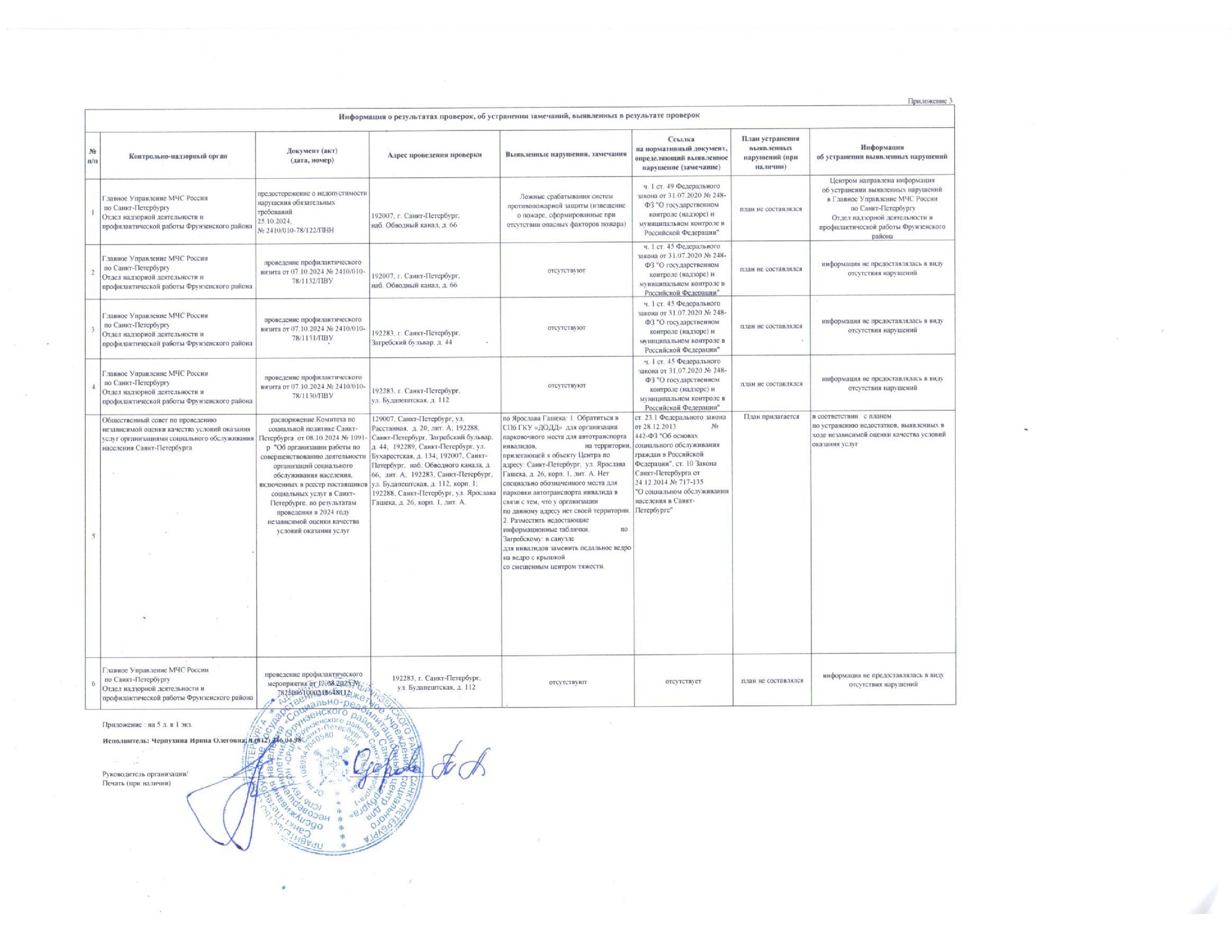 В первом квартале 2023 года в период с 16.02.2023 по 22.02.2023 Прокуратурой Фрунзенского района Санкт-Петербурга в отношении Центра проведена выездная проверка. По результатам проверки Прокуратурой Фрунзенского района Санкт-Петербурга выдано представление от 28.02.2023 № 04-02-2023/15 об устранении нарушений Федерального закона «Об основах системы профилактики безнадзорности и правонарушений несовершеннолетних» от 24.06 1999 № 120-ФЗ, законодательства о социальном питании. Все замечания, выявленные в ходе проверки устранены.